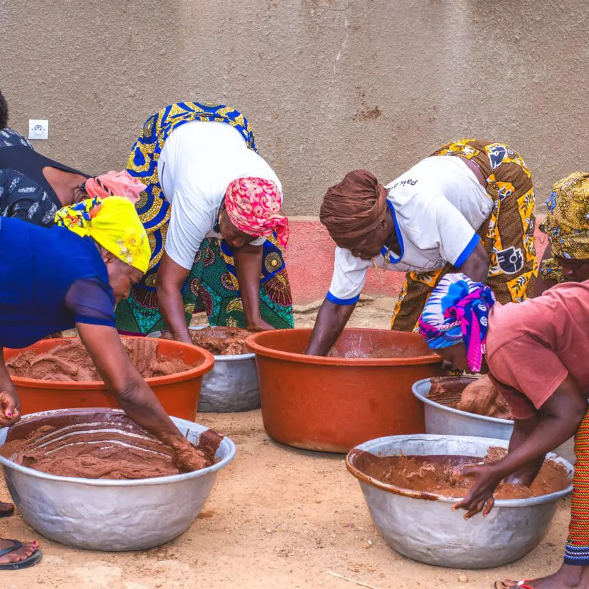 A prima vista, si potrebbe pensare che queste donne, vestite con tessuti colorati, stiano impastando una densa pasta di cioccolato. Quello che però stanno preparando è tutt’altro: burro di karité, un ingrediente ricercato nei cosmetici e nell’alimentazione, dove sostituisce vantaggiosamente l’olio di palma. In Svizzera come altrove, i prodotti di bellezza a base di karité sono rinomati per la loro qualità. «Il burro di karité è un tesoro tramandato di generazione in generazione in Burkina Faso», confida Kiravienou Thérèse Agouabem, membro dell’associazione Lougouzena.