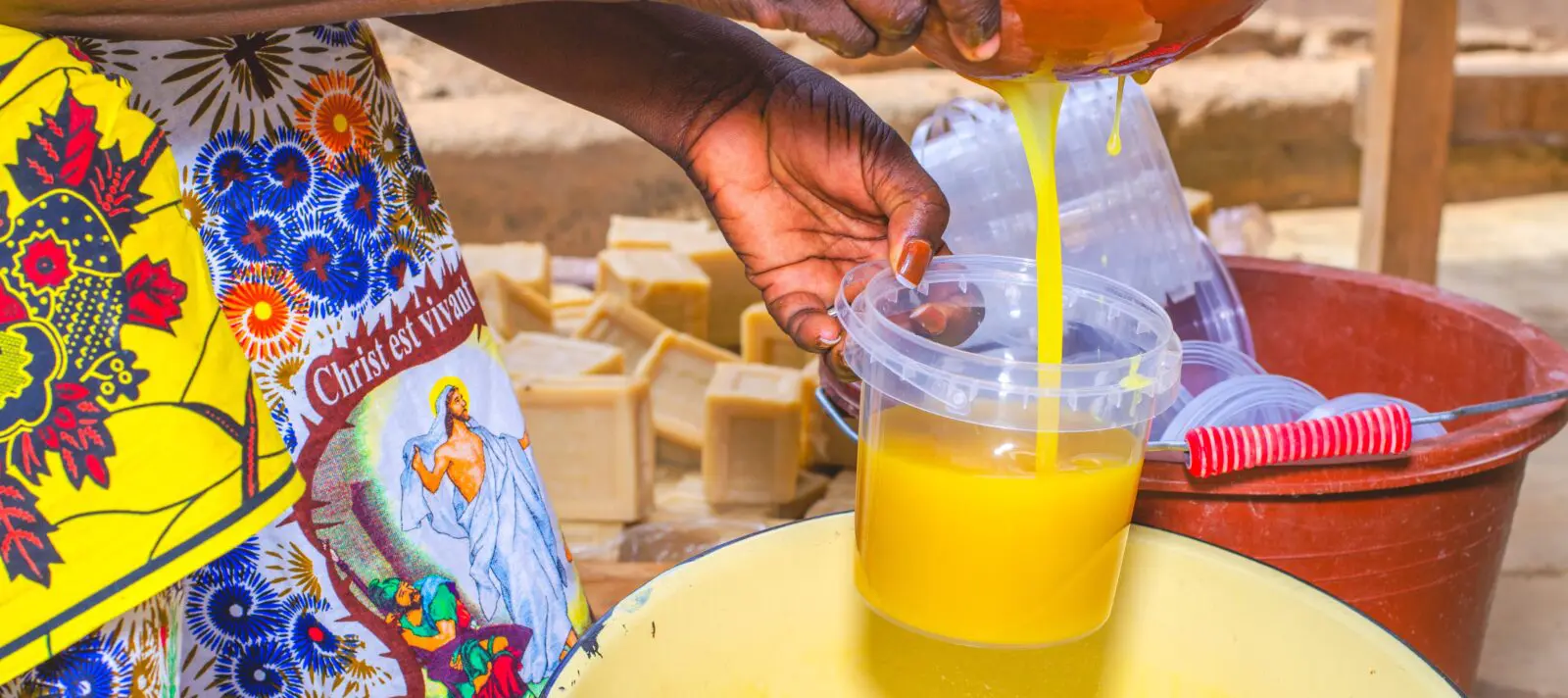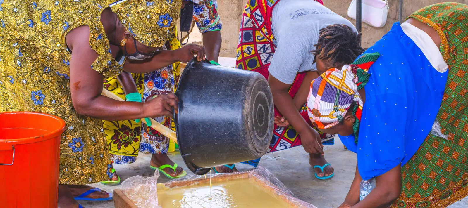 Con il burro di qualità inferiore, le donne producono sapone. «Aggiungiamo all’impasto olio di cocco, acqua, un po’ di profumo e bicarbonato di sodio per solidificarlo», spiega Thérèse. Dopo un giorno di riposo all’ombra, la preparazione si trasforma in sapone. Viene quindi tagliata in blocchi di dimensioni uguali grazie a una macchina semiautomatica, poi contrassegnata con un sigillo.